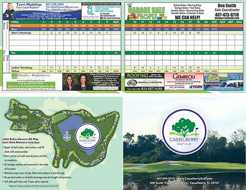 Scorecards feature yardage, handicap and par information for each hole. A map of the entire course is located on the outside of the scorecard along with rules and contact information. We offer two different styles, tri-fold and bi-fold.