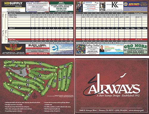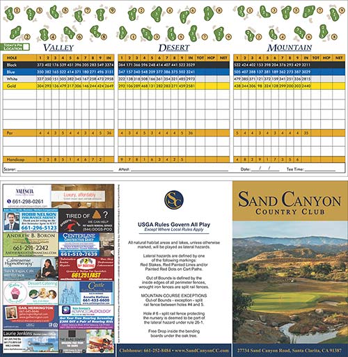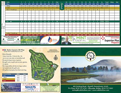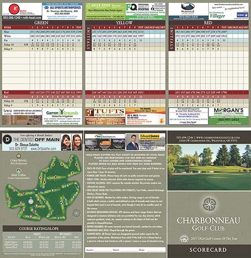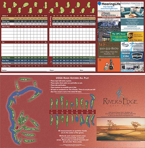 Save your course thousands of dollars with our cost-free, hassle-free scorecards. Top-quality doesn’t have to come with a high price tag! Our design team will work directly with you to customize your scorecard and ensure you are happy with the final product. In-house production allows us flexibility to accommodate golf course needs quickly and easily. Our scorecards are designed with your choice of individual hole pictorials or pin placement illustrations, an aerial course layout, rules of play, and an unlimited variety of color and font choices. And they are always free for your course, from start to finish to delivery.